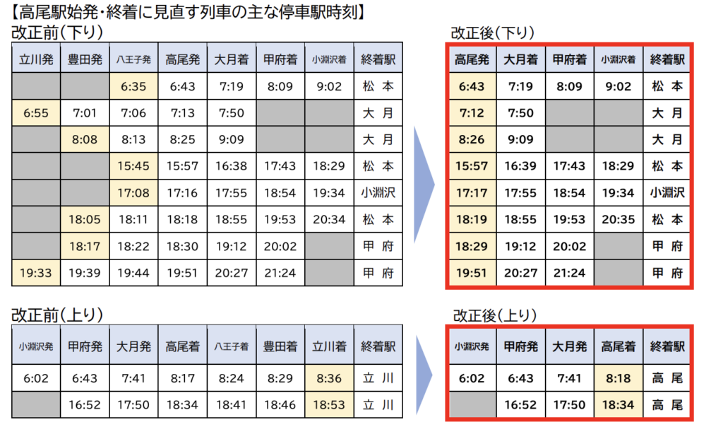 中央快速線のホームドア整備に対応するため、これまで立川・豊田・八王子を始発・終着としていた中央本線普通列車が今回の改正で高尾駅始発・終着にする運転体系に統一されます。