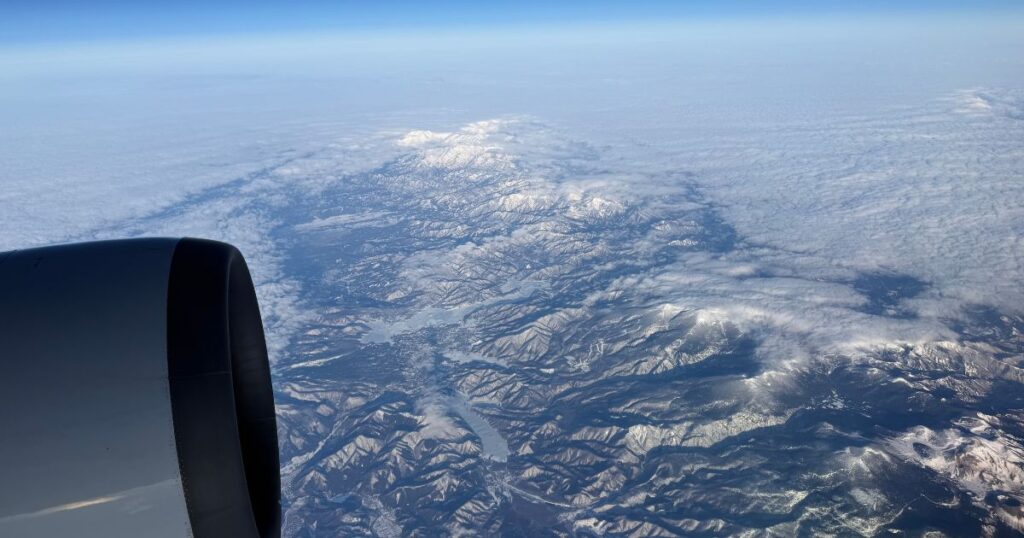 離陸後しばらくすると、雪を被った山々が見えてきました。