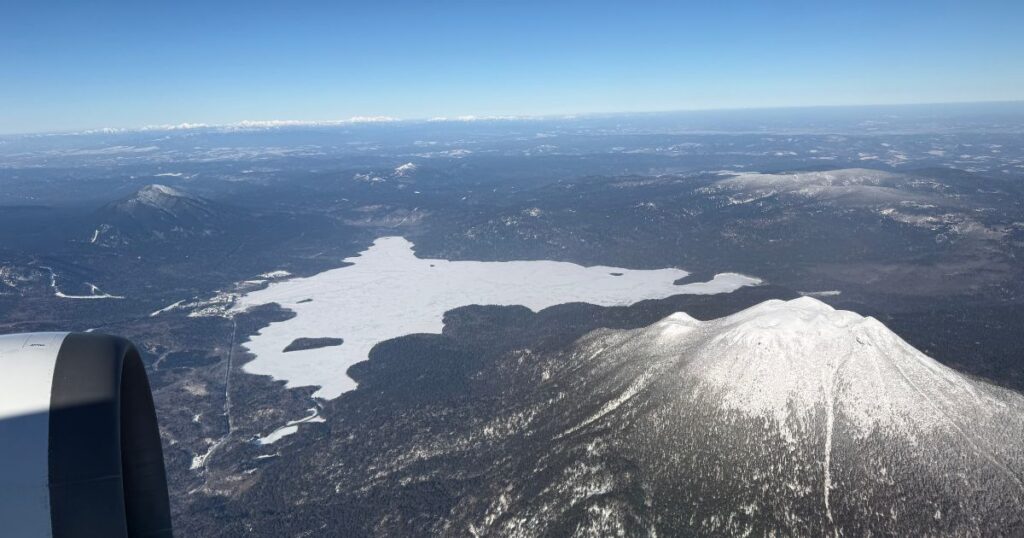 着陸態勢に入ると、左側の窓からは「雄阿寒岳」と雪に覆われた阿寒湖の姿が見えました。空から北海道観光が始まります。