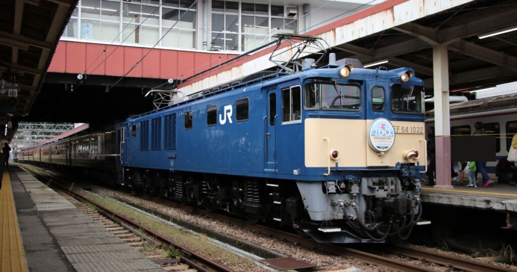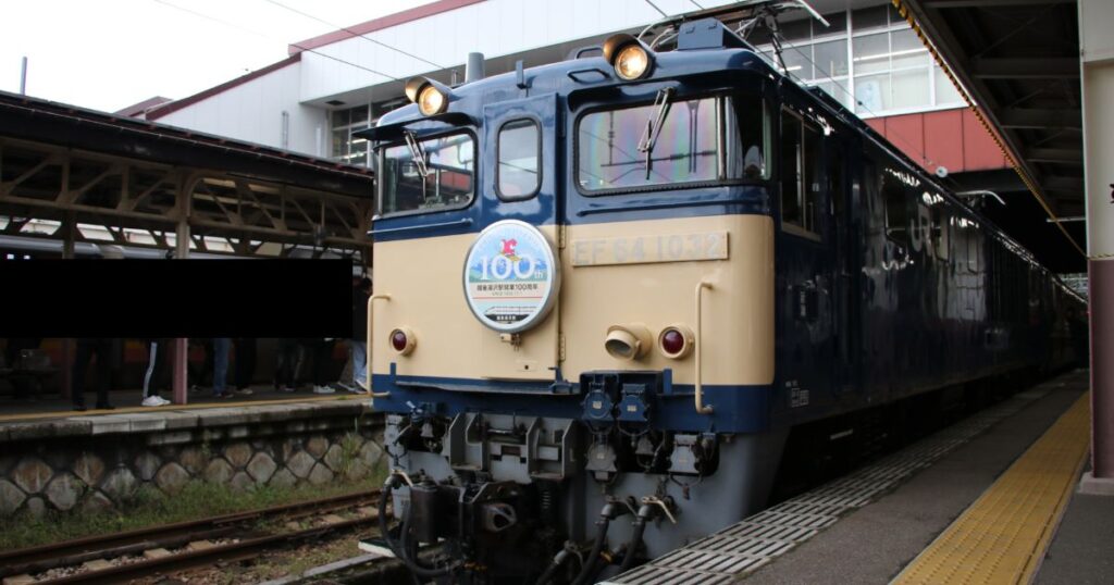 今回の「越後湯沢駅100周年号」は、新潟車両センター所属のEF64形1000番台(1031号機・1032号機) が前後に連結されたプッシュプル編成で運転されました。