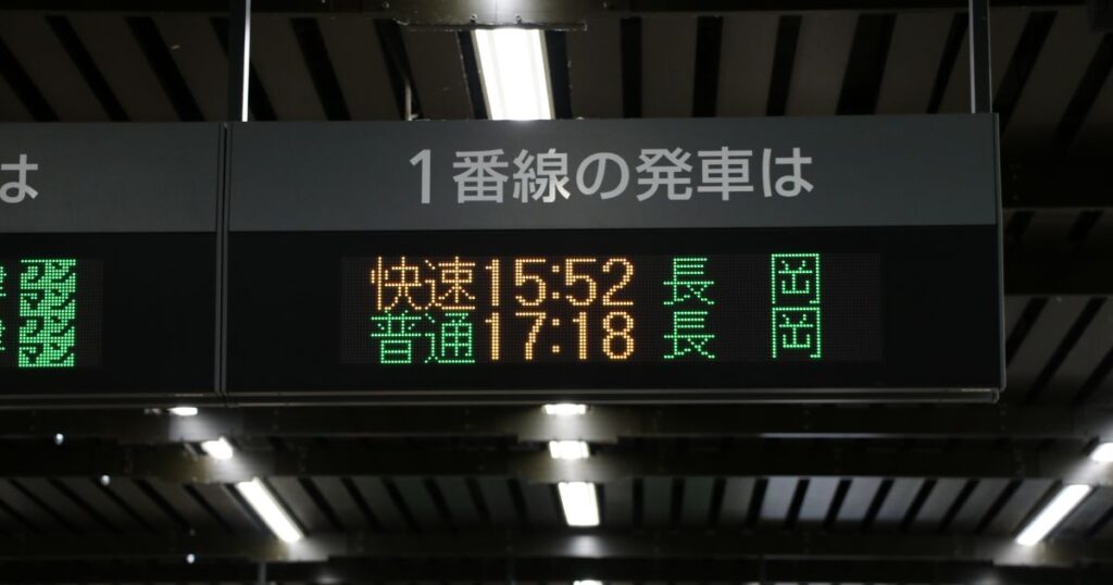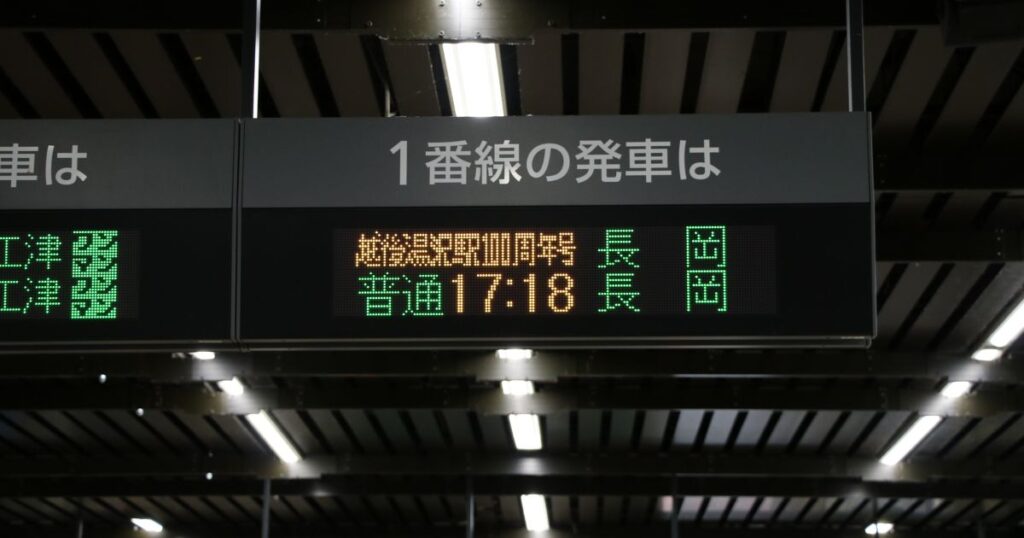 駅の発車案内板には「越後湯沢駅100周年記念号 長岡行き」と「快速 長岡行き」を交互に表示していました。