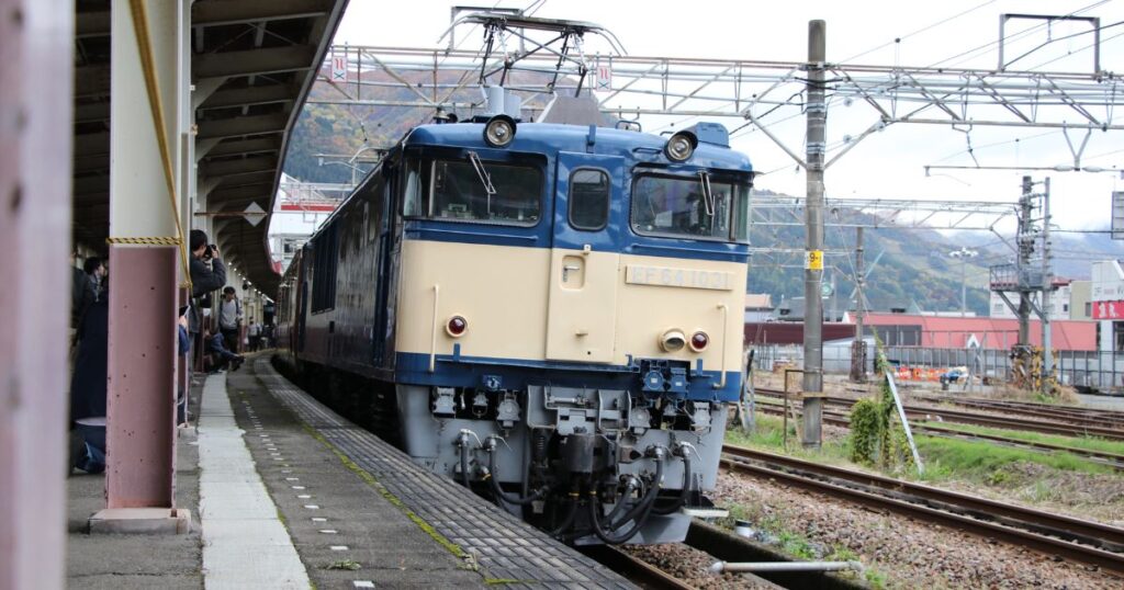 信越本線・上越線を経由し、EF64形1000番台電気機関車がプッシュプル方式でけん引するという、非常に珍しい編成です。