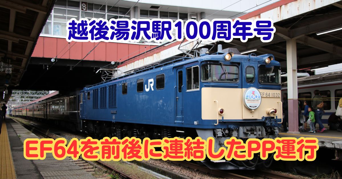今回の「越後湯沢駅100周年号」は、新潟車両センター所属のEF64形1000番台(1031号機・1032号機) が前後に連結されたプッシュプル編成で運転されました。